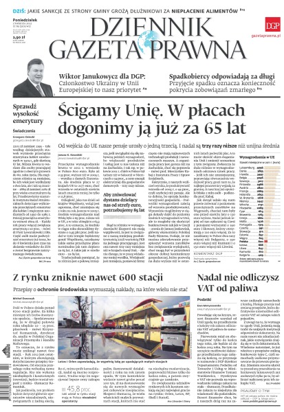 Ścigamy Unię Europejską – w płacach dogonimy ją już za 65 lat – od wejścia do UE nasze pensje urosły o jedną trzecią i nadal są trzy razy niższe niż unijna średnia; sprawdź wysokość emerytury; Wiktor Janukowycz dla DGP – „Członkostwo Ukrainy w Unii Europejskiej to nasz priorytet”; spadkobiercy odpowiadają za długi – przyjęcie spadku oznacza konieczność pokrycia zobowiązań zmarłego; jakie sankcje ze strony gminy grożą dłużnikowi za niepłacenie alimentów; z rynku zniknie nawet 600 stacji paliwowych – przepisy o ochronie środowiska wymuszają nakłady, na które wielu nie stać; nadal nie odliczysz VAT od paliwa.
