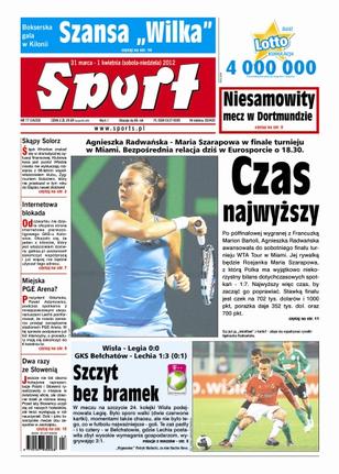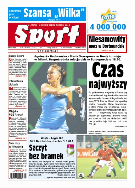 Agnieszka Radwańska i Maria Szarapowa zmierzą się w finale turnieju w Miami; Śląsk Wrocław znalazł się w dramatycznej sytuacji finansowej; dlaczego od czwartku nie działa oficjalna strona internetowa pierwszoligowego GKS-u Katowice; miasto Gdańsk zamierza przejąć zarządzanie stadionem PGE Arena; w meczu na szczycie 24. kolejki Wisła podejmowała Legię – było sporo walki, ale bramki nie padły.