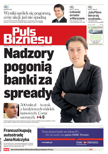 500 mln zł — to zysk z coraz szerszych kredytowych widełek kursowych; Francuzi kupują autostradę Jana Kulczyka; Julia Pitera szuka nieprawidłowości w służbie zdrowia; w kolejnych kwartałach spadną zyski krajowych spółek, na szczęście indeksy dyskontują niemal recesję; Latvian Shipping Company rozmawia z władzami polskiej giełdy, które ostrzą sobie apetyt na więcej debiutów firm z regionu bałtyckiego.