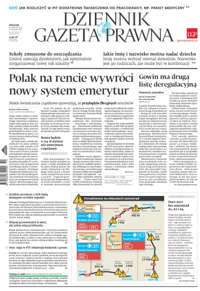 Polak na rencie wywróci nowy system emerytur – niskie świadczenia cząstkowe spowodują, że przybędzie fikcyjnych rencistów; jak rozliczyć w PIT dodatkowe świadczenia od pracodawcy, np. pakiet medyczny; Jarosław Gowin ma drugą listę deregulacyjną; Euro 2012 bez autostrad A1, A2 i A4; szybkie przelewy z KIR będą dostępne za kilka tygodni; więcej prywatności w sieci, ale także więcej klikania – Ministerstwo Administracji i Cyfryzacji zamierza zmienić prawo telekomunikacyjne tak, by instalowanie służących do celów reklamowych cookies wymagało zgody użytkownika; Naczelny Sąd Administracyjny stwierdził, że ulga meldunkowa przy sprzedaży nieruchomości obejmuje nie tylko wartość budynku, lecz także wartość gruntu, na którym jest on postawiony.