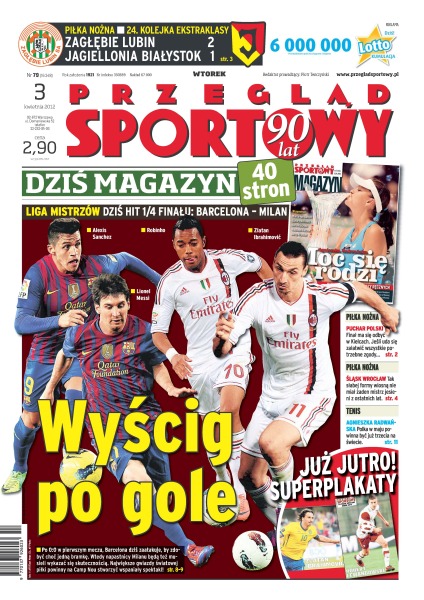 Wyścig po gole – dziś hit ćwierćfinału Barcelona zmierzy się z Milanem – po remisie 0-0 w pierwszym meczu, Barcelona dziś zaatakuje, by zdobyć choć jedną bramkę; Zagłębie Lubin pokonało Jagiellonię Białystok 2-1; finał Pucharu Polski ma się odbyć w Kielcach, jeśli uda się załatwić wszystkie potrzebne zgody; Śląsk Wrocław – tak słabej formy wiosną nie miał żaden mistrz jesieni z ostatnich lat; Agnieszka Radwańska – Polka w maju powinna być już trzecia na świecie.