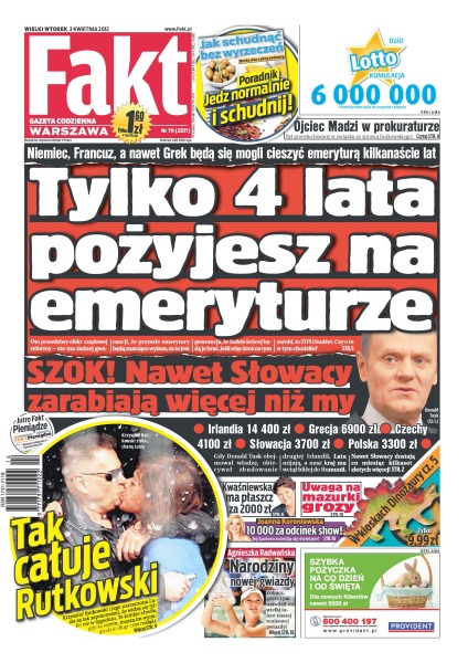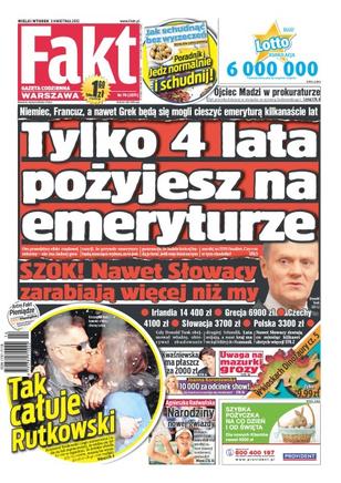 Tylko cztery lata pożyjesz na emeryturze – Niemiec, Francuz, a nawet grek będą mogli się cieszyć emeryturą kilkanaście lat; szok, nawet Słowacy zarabiają więcej niż my; zobacz jak całuje Krzysztof Rutkowski; uwaga na mazurki grozy; Agnieszka Radwańska – narodziny nowej gwiazdy; Jolanta Kwaśniewska ma płaszcz za 2000 złotych; Joanna Koroniewska dostała podwyżkę – 10 tysięcy złotych za odcinek show; ojciec Madzi w prokuraturze – był przesłuchiwany w związku ze sprawą Krzysztofa Rutkowskiego.