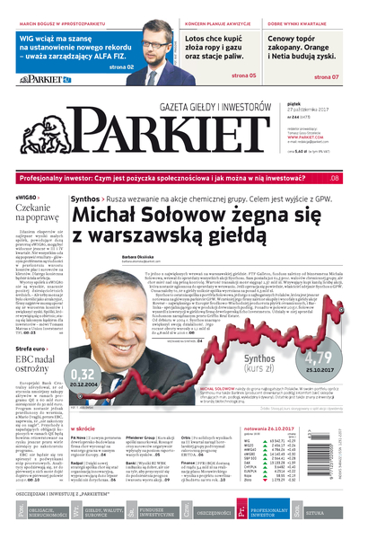 Największy w Polsce newsroom gospodarczy zbiera, analizuje i zgłębia dla Państwa najważniejsze informacje ze świata finansów. Codzienne wydanie „Parkietu”, sześć dni w tygodniu, to kilkadziesiąt artykułów o emitentach, instytucjach finansowych, gospodarce. To również opinie, felietony i wywiady z najważniejszymi ludźmi krajowej i globalnej finansjery.