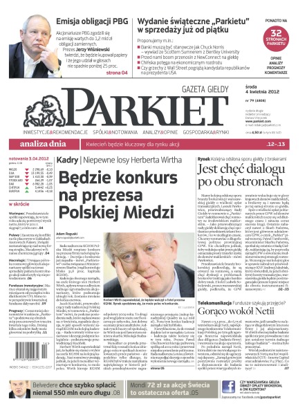 Będzie konkurs na prezesa Polskiej Miedzi – niepewne losy Herberta Wirtha; emisja obligacji PBG – akcjonariusze zgodzili sie na emisję wartych do 1,2 miliarda złotych obligacji zamiennych; kolejna odsłona sporu giełdy z brokerami – jest chęć dialogu po obu stronach; gorąco wokół Netii – czy fundusze szykują przejęcie; zaostrza się konflikt na tle płacowym w Zakładach Azotowych Puławy – związki zastanawiają się nad nową formą strajku; trwające pół roku rozmowy głównych akcjonariuszy spółki Macrologic na temat sprzedaży pakietu kontrolnego zakończyły się niepowodzeniem; marzec okazał się najgorszym miesiącem od początku roku dla klientów TFI; Belvedere chce szybko spłacić niemal 550 milionów euro długu.