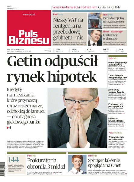 Getin odpuścił rynek hipotek – kredyty na mieszkania, które przynoszą coraz niższe marże, odchodzą do lamusa – oto diagnoza giełdowego banku; niższy VAT na rentgen, a na przebudowę gabinetu nie; pieniądze z polisy na czas przestoju – ubezpieczenie BI pomoże, gdy żywioł uniemożliwi firmie działalność; konferencja w chmurze – sektor MSP polubił wideokonferencje; biznes pielgrzymuje do Chile i Peru – PESA, Lubawa, Krakchemia, Grew i DZT jadą zdobywać rynki Ameryki Łacińskiej; Janusz Guy wesprze Sygnity – specjalista od białych rycerzy ratujących spółki przed wrogin przejęciem zasiadł w nadzorze spółki z branży IT; producenci płyt pod lupą UOKiK – urząd antymonopolowy podejrzewa zmowę działających w Polsce firm ze Szwajcarii i Niemiec; fundusze krążą nad Netią – jednym z zainteresowanych przejęciem operatora jest udziałowiec sieci Play; Ringier Axel Springer Polska łakomie spogląda na Onet.