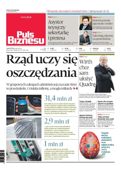 Rząd uczy się oszczędzania – w grupowych zakupach administracja na razie tkwi w przedszkolu – uciułała miliony, a mogła miliardy; asystor wyręczy sekretarkę i prezesa – pakiety assistance dla MSP są coraz bogatsze, dołączane są do ubezpieczeń, kont i kart bankowych; system może ograniczyć ryzyko – dzięki ERM firmy radzą sobie z kryzysem; faktoring odporny na spowolnienie – Mirosław Jakowiecki wyjaśnia skąd bierze się sukces branży; Wirth chce sam ułożyć Quadrę – tak prezes KGHM uzasadnia zamiar wystartowania w planowanym konkursie na nowego szefa spółki; targi o Empik – fundusze szykują się do kulminacyjnej rozgrywki o akcje sieci; Open Life zaczęło szturm na podium – ubezpieczyciel szybko rośnie dzięki sprzedaży produktów strukturyzowanych.