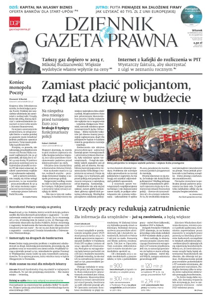 Dlaczego zamiast płacić policjantom, rząd łata dziurę w budżecie; zagraniczne doświadczenie przestało być atutem na naszym rynku pracy; nie tylko pacjenci mają problem z przyjęciem do dobrego szpitala; czy Rosjanie przejmą grecką energetykę; HBO, Fox czy AXN ścigają się z TVP, Polsatem i TVN-em na seriale; ubezpieczyciele planują podwyżki – jak ich uniknąć; Jakub Karnowski zamienił wygodną funkcję prezesa PKO TFI na gorący fotel szefa PKP; wreszcie koniec monopolu Poczty Polskiej w urzędach; ubywa doradców zawodowych – to zła informacja dla osób pozostających bez pracy, bo takich specjalistów już brakuje; przy ocenie nauczyciela akademickiego uwzględnia się opinie przedstawione przez studentów i doktorantów.