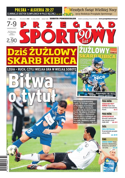 Mecz Legii Warszawa z Ruchem Chorzów może rozstrzygnąć o mistrzostwie Polski; dla Śląska Wrocław spotkanie z PGE GKS jest ostatnią szansą na włączenie się do walki o tytuł; SportFive prowadzi rozmowy o przyszłości wrocławskiego Stadionu Miejskiego; 12 zawodników jest już gotowych do Euro 2012; polscy piłkarze ręczni pokonali Algierię i zrobili pierwszy krok na drodze do Londynu; żużlowcy zmieniają kluby.
