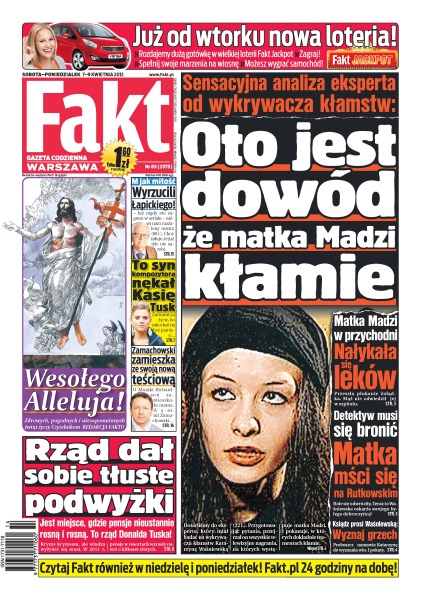 Matka małej Madzi nałykała się leków i przeszła płukanie żołądka; eksperci dokonali analizy zachowań Katarzyny Waśniewskiej i są pewni, że od początku kłamie; w rządzie podwyżki pensji nawet o 744 złote; syn znanego kompozytora nękał Kasię Tusk; przebudowa drogi z Warszawy do Katowic nie jest zrealizowana nawet w połowie; prezes PKP została zwolniona z pracy, po czym przyjęta na stanowisko wiceprezesa z ponaddwukrotnie wyższą pensją; posłanka Anna Grodzka twierdzi, że w Sejmie jest jeszcze jedna osoba po zmianie płci; Andrzej Łapicki został zwolniony z „M jak miłość”.