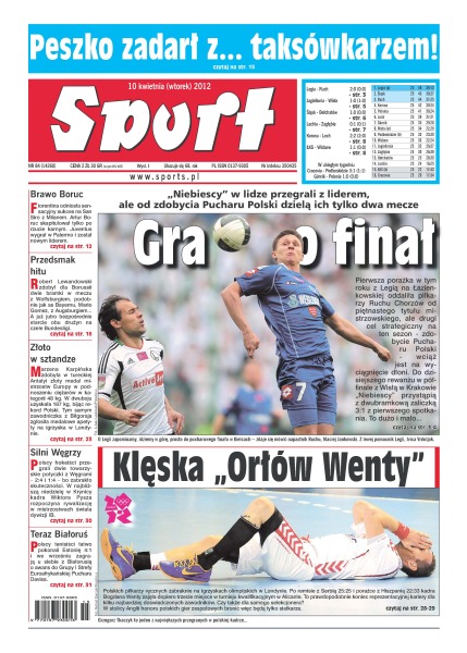 „Niebiescy” w lidze przegrali z liderem, ale od zdobycia Pucharu Polski dzielą ich tylko dwa mecze; polskich piłkarzy ręcznych zabraknie na igrzyskach olimpijskich w Londynie; po ciężko wywalczonym zwycięstwie z Bełchatowem drużyna Oresta Lenczyka wróciła na fotel wicelidera tabeli; Fiorentina odniosła sensacyjny sukces na San Siro – polski bramkarz skapitulował tylko po rzucie karnym; sześć udanych podejść, cztery rekordy Polski i pierwszy w karierze tytuł mistrzyni Europy – właśnie z tym Marzenie Karpińskiej kojarzyć się będą tegoroczne święta Wielkanocne.