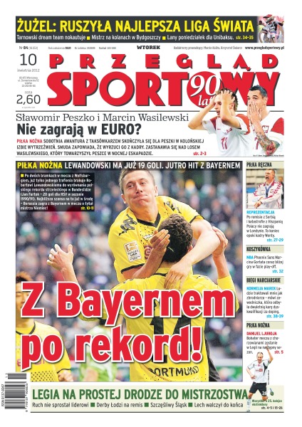 Po dwóch bramkach w meczu z Wolfsburgiem, już tylko jednego trafienia brakuje Robertowi Lewandowskiemu do wyrównania polskiego rekordu strzeleckiego w Bundeslidze; Sławomir Peszko i Marcin Wasilewski w sobotnią noc uczestniczyli w nocnej awanturze w taksówce; PSG pokonało w klasyku Olympique Marsylia; Kolejorz pokazał to, czego niektórym jego piłkarzom brakowało od początku rundy wiosennej; piłkarze ręczni z kretesem przegrali walkę o igrzyska olimpijskie – zadecydował zaledwie remis z Serbią; Phoenix Suns mają ogromne szanse na play-off – mówi Gortat po zwycięstwie 125:105 nad Los Angeles Lakers.