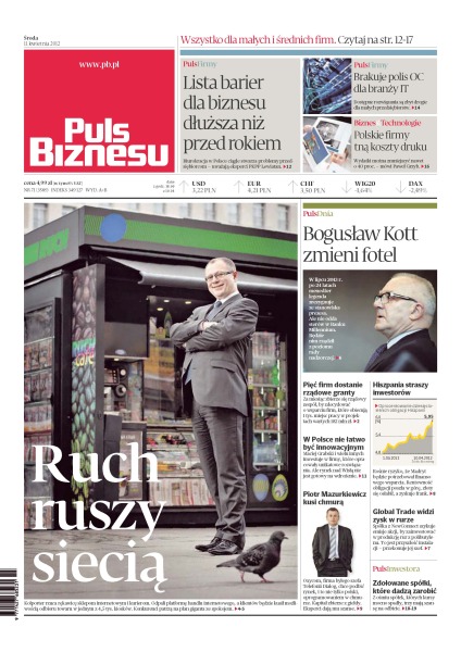 odbioru towaru w jednym z 4,5 tysiąca kiosków; lista barier dla biznesu dłuższa niż przed rokiem; brakuje polis OC dla branży IT – dostępne rozwiązania są zbyt drogie dla małych przedsiębiorców; polskie firmy tną koszty druku; Bogusław Kott zmieni fotel – po 24 latach menedżer legenda zrezygnuje ze stanowiska prezesa, ale nie odda sterów w Banku Millennium, będzie nim rządził z poziomu rady nadzorczej; pięć firm dostanie rządowe granty; Hiszpania straszy inwestorów – rośnie ryzyko, że Madryt będzie potrzebował finansowego wsparcia; Global Trade widzi zysk w rurze – spółka z NewConnect szykuje emisje akcji, by zainwestować w produkcję rur z polibutylenu.