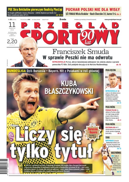 Liczy się tylko tytuł – dziś mecz Borussia - Bayern – hit z Polakami w roli głównej; „W sprawie Peszki nie ma odwrotu” – Franciszek Smuda; Puchar Polski nie dla Wisły – drużyna z Krakówa odpadła po rzutach karnych; PGE Skra Bełchatów pierwszym finalistą PlusLigi – w drugim półfinale zmierzyły się Asseco Resovia i Zaksa Kędzierzyn Koźle z wynikiem 3-2; decyzja co do dalszej pracy Bogdana Wenty jako selekcjonera drużyny narodowej zapadnie najwcześniej 23 kwietnia; za zdobycie Pucharu piłkarze Legii mogą zarobić prawie milion złotych – najpierw muszą ograć Arkę Gdynia; Urszula Radwańska blisko sensacyjnej wygranej nad Karoliną Woźniacką.