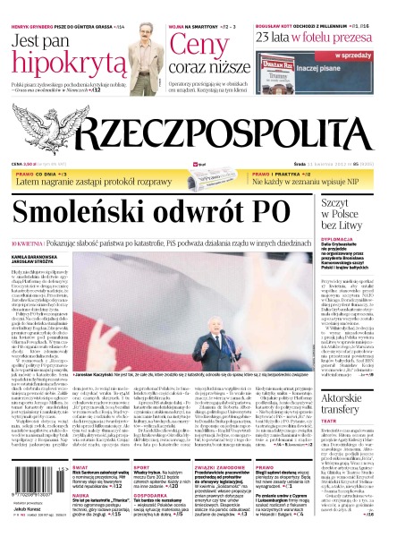 Smoleński powrót PO – pokazując słabość państwa po katastrofie, PiS podważa działania rządu w innych dziedzinach; „Jest pan hipokrytą” – Henryk Grynberg pisze do Guentera Grassa; ceny coraz niższe – operatorzy prześcigają się w obniżkach cen urządzeń, korzystają na tym klienci; Rick Santorum zakończył walkę o nominację prezydencką – Mitt Romney staje się faworytem wśród republikanów; sto lat po katastrofie „Titanica” mimo ogromnego postępu techniki, góry lodowe pozostają groźne dla żeglugi; tak bardzo nie narzekamy – większość Polaków ocenia swoją sytuację materialną jako przeciętną lub dobrą; biegli sądowi dostaną więcej pieniędzy za ekspertyzy; szczyt w Polsce bez Litwy – Dalia Grybauskaite nie przyjedzie na organizowany przez prezydenta Bronisława Komorowskiego szczyt Polski i krajów bałtyckich.