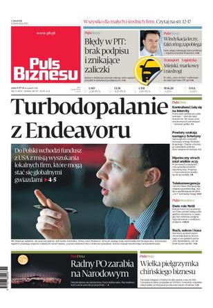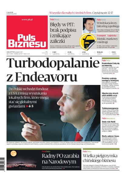 Turboodpalanie z Endeavoru – do Polski wchodzi fundusz z USA z misją wyszukania lokalnych firm, które mogą stać się globalnymi gwiazdami; błędy w PIT – brak podpisu i znikające zaliczki – system e-deklaracje pozwala uniknąć wielu częstych pomyłek w zeznaniach podatkowych; windykacja leczy, faktoring zapobiega; miejski, markowy i niedrogi – w cyklu „Auto do floty” rozbierany na części będzie Volkswagen Up; kontrahenci żalą się na InterCity – przewoźnik spóźnia się z płatnościami; powiaty szukają następcy Schetyny – samorządowcy wymyślili koncepcję nowego funduszu drogowego; hipoteczny strach miał wielkie oczy – prognozy o 15-procentowym spadku sprzedaży kredytów się nie sprawdziły; Cyfrowy Polsat i Plus zaczynają wzajemną sprzedaż usług – analitycy spodziewają się też oferty „4 w 1” pod marką Orange; radny PO zarabia na Narodowym – dekoniunktura nie dotyka firmy Piotra Kalbarczyka – pięć stadionowych umów potroiło jej przychody.