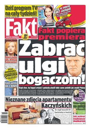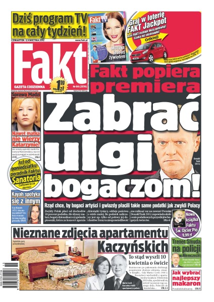 Zabrać ulgi bogaczom – Fakt popiera premiera – rząd chce, by bogaci artyści i gwiazdy płacili takie same podatki jak zwykli Polacy; sprawa Madzi – nawet matka nie wierzy Katarzynie; nieznane zdjęcia apartamentu Kaczyńskich – zobacz jak zostawili mieszkanie gdy wyszli 10 kwietnia; trener Franciszek Smuda na policji w Niemczech – czy selekcjoner zadarł z prawem; Kayah spotyka się z innym – co na to Pako; jak wybrać najlepszy makaron – poradnik kulinarny.