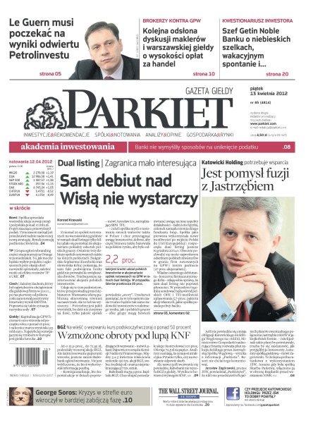 Sam debiut nad Wisłą nie wystarczy – zagranica mało interesująca – średni udział polskich inwestorów w akcjonariacie spółek notowanych na GPW w ramach dual listingu to 2,2 procenta; wzmożone obroty pod lupą KNF – na wieść o wezwaniu kurs BGŻ podskoczył wczoraj o ponad 50 procent; spółka Bomi sprzedała wszystkie akcje nowej emisji i pozyskała ponad 10 milionów złotych; Grupa TP ogłosi rebranding części stacjonarnej na Orange w poniedziałek; Zachem, spółka zależna spółki Ciech, po raz pierwszy od półtora roku zanotował pozytywny kwartalny wynik EBITDA; kapitalizacja GPW liczona w euro wzrosła od początku roku o ponad 16 procent i na koniec marca wyniosła 125 mld euro; Le Guern musi poczekać na wyniki odwiertu Petrolinvestu; brokerzy kontra GPW – kolejna odsłona dyskusji maklerów i warszawskiej giełdy o wysokości opłat za handel.