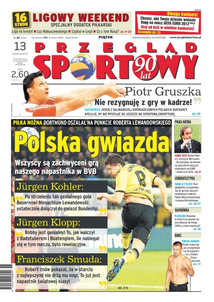 Polska gwiazda – wszyscy są zachwyceni grą naszego napastnika w BVB – Dortmund oszalał na punkcie Roberta Lewandowskiego; „Nie rezygnuję z gry w kadrze” – Piotr Gruszka apeluje, by nie wysyłać go jeszcze na sportową emeryturę; Michel Platini z wizytą w Warszawie – „Do wymiany są murawy na wszystkich waszych stadionach na EURO” – mówił szef UEFA; jak przygotowują się do igrzysk nasze medalowe nadzieje w skoku o tyczce – Paweł Wojciechowski i Łukasz Michalski; Rzeszów w euforii po awansie Asseco Resovii do finału – czy ZAKS-ę czeka rewolucja; Tomasz Adamek rozpoczął już przygotowania do pojedynku z Eddym Chambersem.