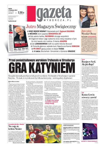Gra Katyniem – przed poniedziałkowym wyrokiem Trybunału w Strasburgu – rosyjski dziennik puścił przeciek przed wyrokiem Trybunału w Strasburgu w sprawie Katynia; rozejm w Syrii, ale jak długo – po miesiącach brutalnych walk, w których zginęło co najmniej 9 tysięcy osób, wczoraj weszło w życie żmudnie negocjowane zawieszenie broni; komu Gowin otworzy zawód – ponad 200 opinii dostał resort sprawiedliwości do projektu ustawy deregulacyjnej; Robert Lewandowski dla „Gazety” – „Nie czuję się królem Niemiec, ja tylko strzeliłem gola”; brakuje leków dla chorych na raka – wytwarzająca je firma ma kłopoty z modernizacją linii produkcyjnej; w USA gaz najtańszy od 10 lat – Amerykanie dostaną niższe rachunki dzięki obfitości surowca z łupków.