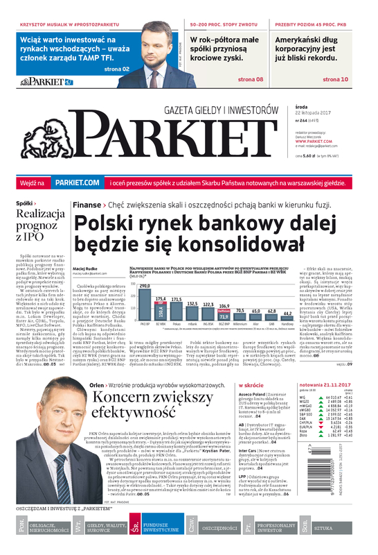 Największy w Polsce newsroom gospodarczy zbiera, analizuje i zgłębia dla Państwa najważniejsze informacje ze świata finansów. Codzienne wydanie „Parkietu”, sześć dni w tygodniu, to kilkadziesiąt artykułów o emitentach, instytucjach finansowych, gospodarce. To również opinie, felietony i wywiady z najważniejszymi ludźmi krajowej i globalnej finansjery.