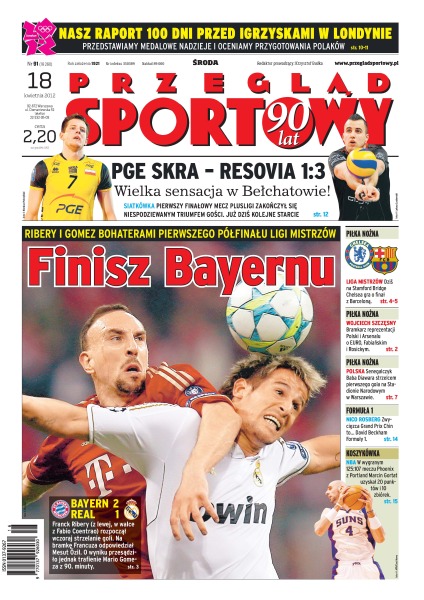 Bayern Monachium wygrał z Realem Madryt; Dziś na Stamford Bridge Chelsea gra o finał Ligi Mistrzów z Barceloną; Wojciech Szczęsny, bramkarz reprezentacji Polski i Arsenalu Londyn o EURO, Fabiańskim i Rosickym.