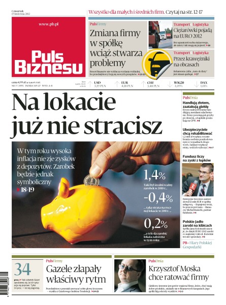 1,2 mld zł wypłaca rocznie branża osobom poszkodowanym w wypadkach drogowych – zamiast wypłacać renty, woli ich leczyć; Polskie Jadło liczy, że dzięki Euro 2012 zarobi co najmniej 1 mln zł i rozwinie sieć sprzedaży; przedsiębiorcy przestali zawracać sobie głowę kryzysem – wynika z Gazelowego Indeksu Tendencji; w tym roku wysoka inflacja nie zje zysków z depozytów.
