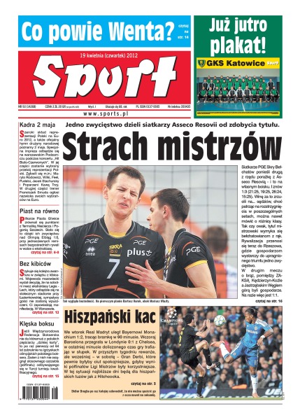 Jedno zwycięstwo dzieli siatkarzy Asseco Resovii od zdobycia tytułu; 2 maja poznamy skład polskiej reprezentacji na Euro 2012; piłkarze Piasta Gliwice zrównali się punktami z Termalką Nieciecza i Pogonią Szczecin.