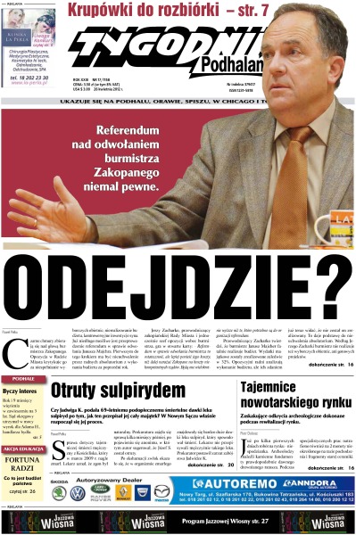 Referendum nad odwołaniem burmistrza Zakopanego niemal pewne; nielegalne schody przed sklepem to błahostka wobec całego deptaka na Krupówkach, który powstał nielegalnie; uzbrojony w rękawiczki, chwytak i zielony worek Lee Feinstein, ambasador USA w Polsce, wędrował w niedzielę Doliną Strążyską; droga wojewódzka od Czarnego Dunajca