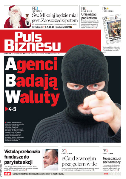 Agencja Bezpieczeństwa Wewnętrznego sprawdza, czy ktoś sztucznie osłabia złotego; to ostatni kwartał przed kryzysem — mówią ekonomiści i giełdowe spółki; walne Zgromadzenie Akcjonariuszy Vistuli i W.Kruka przegłosowało fuzję i przelicznik wymiany akcji 2,4:1; 2 mln rodzin zyska dostęp do internetu dzięki likwidacji białych plam przez TP.