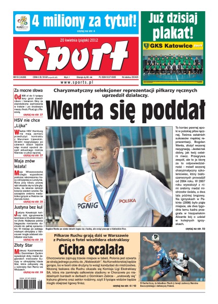 Bogdan Wenta zrezygnował z funkcji trenera reprezentacji piłkarzy ręcznych; piłkarze Ruchu Chorzów grają dziś w Warszawie z Polonią o fotel wicelidera ekstraklasy; władze HSV Hamburg nie mają zamiaru przedłużyć kontraktu z Marcinem Lijewskim.