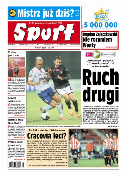 Posrebrzany puchar Henri Delaunaya, główne trofeum Euro 2012, rozpoczął podróż po Polsce i Ukrainie; porażki w Champions League skomplikowały sytuację Realu Madryt i Barcelony; o koszykarskie mistrzostwo Polski zagrają Wisła Can Pack Kraków i CCC Polkowice.