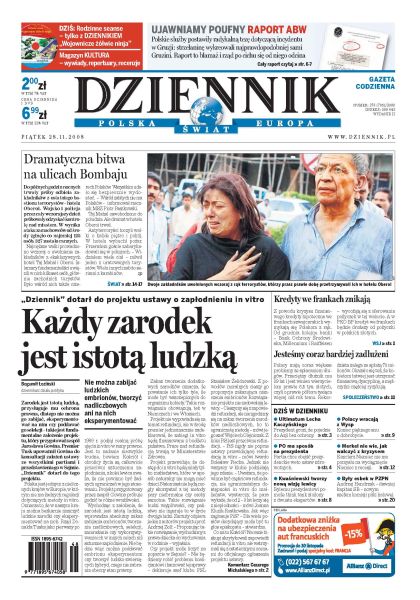 W wyniku ataków terrorstów w Bombaju zginęło do środy co najmniej 125 osób, przez cały wczorajszy dzień wojsko i policja próbowały odzyskać kontrolę nad miastem; radyklana teza polskich służb na temat incydentu w Gruzji - "Dziennik" ujawnia tajny raport ABW; co znajduje się w projekcie ustawy o zapłodnieniu in vitro; prezydent grozi, że do Azji pojedzie bez ochrony; PO chce obejśc prezydenckie weto ustaw zdrowotnych; Aleksander Kwaśniewski tworzy nową wizję lewicy; Polacy mają coraz większe problemy ze spłacaniem długów; Wileka Brytania nie jest już rajem dla emigrantów, kryzys finansowy daje się we znaki. Dodatki: The Wall Street Journal, Warszawa, Kultura, Kultura TV.
