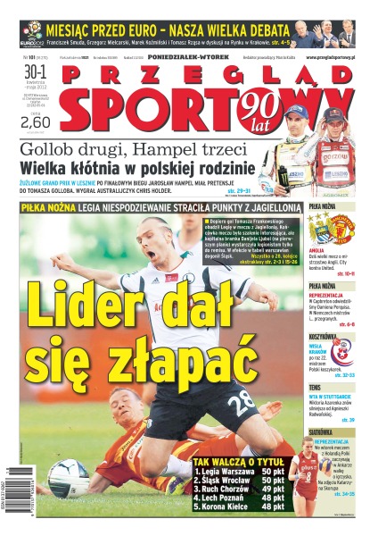Lider dał się złapać – Legia niespodziewanie straciła punkty z Jagiellonią; miesiąc przed Euro – nasza wielka debata; Gollob drugi, Hampel trzeci – wielka kłótnia w polskiej rodzinie – po finałowym biegu w Żużlowych Grand Prix w Lesznie Jarosław Hampel miał pretensje do Tomasza Golloba; dziś wielki mecz o mistrzostwo Anglii – City kontra United; Wisła Kraków po raz 22 mistrzem Polski koszykarek; Wiktoria Azarenka znów silniejsza od Agnieszki Radwańskiej; we wtorek meczem z Holandią Polki zaczynają w Ankarze walkę o igrzyska.
