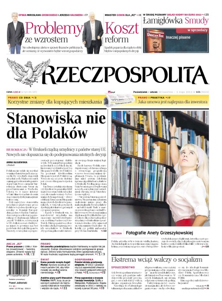 Stanowiska nie dla Polaków – w Brukseli rządzą urzędnicy z państw starej UE – nowych nie dopuszcza się do podejmowania istotnych decyzji; problemy ze wzrostem – nie odwołujemy alertu w sprawie finansów publicznych, ale oceniamy, że wyzwaniem będzie wzrost gospodarczy; koszt reform – spadek poparcia dla rządu to efekt błędów i niepopularnych decyzji; jaka umowa jest najlepsza dla inwestora; korzystne zmiany dla kupujących mieszkania; od czwartku przedsiębiorca będzie traktowany w sądzie tak jak obywatel – zostaje zlikwidowane odrębne postępowanie gospodarcze; firmy zapomniały o kryzysie i zaczęły inwestycje; ambitne plany partii litewskich Polaków – AWPL liczy, że po jesiennych wyborach do Sejmu uzyska kilkanaście mandatów i wejdzie do rządu; polskie lotniska przeżywają oblężenie; komu pomoże recepta Angeli Merkel – kanclerz oczekuje od innych państw Unii, aby reformowały się według wzorca niemieckiego.