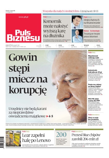Jarosław Gowin stępi miecz na korupcję – urzędnicy nie będą karani za nieprawdziwe oświadczenia majątkowe; komornik może nałożyć wyższą karę na dłużnika – w nowelizacji kodeksu postępowania cywilnego grzywny za unikanie komornika wzrosły kilkakrotnie; twarzą w twarz przez internet – Włodzimierz Smętek uważa, że wideokonferencje to już standard; mniej chętnych na finansowanie – Krzysztof Kuniewicz przekonuje, że faktoring to lek na słabą płynność; niepokonani zwierają szyki – przedsiębiorcy poszkodowani przez państwo organizują kongres; autostrada Kulczyka po 20 gr za kilometr; Lear zapełni halę po Lenovo – amerykański koncern rozmawia o zakupie obiektu w Legnickim Polu; prezesi blue chipów zarobili 206 mln zł – tylko trzech menedżerów z giełdowej ekstraklasy zarobiło w ubiegłym roku mniej niż w 2010 roku.