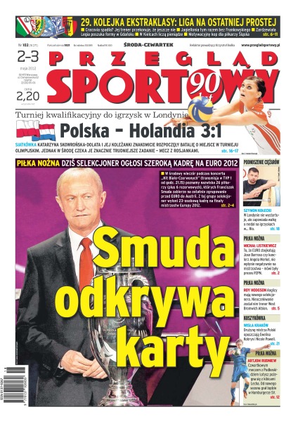 Franciszek Smuda odkrywa karty – dziś selekcjoner ogłosi szeroką kadrę na Euro 2012; polska drużyna siatkarek pokonała Holandię 3-1 – Katarzyna Skowrońska-Dolata i jej koleżanki znakomicie rozpoczęły batalię o miejsce w turnieju olimpijskim; Szymon Kołecki w Londynie nie wystartuje, ale zapowiada walkę o medal na igrzyskach w Rio; Michał Listkiewicz twierdzi, że fakt zbojkotowania Euro przez Jose Barroso czy kanclerz Angelę Merkel nie wpłynie negatywnie na mistrzostwa; Anglicy mają nowego selekcjonera – nieoczekiwanie został nim trener West Bromwich Albion Roy Hodgson; Ewelina Kobryn i Nicole Powell opuszczają drużynę mistrza Polski, Wisłę Kraków; Artjom Rudniew po raz ostatni zagra w Lechu w czwartek, w meczu z Podbeskidziem, w nowym sezonie będzie grał w Hamburgerze SV.