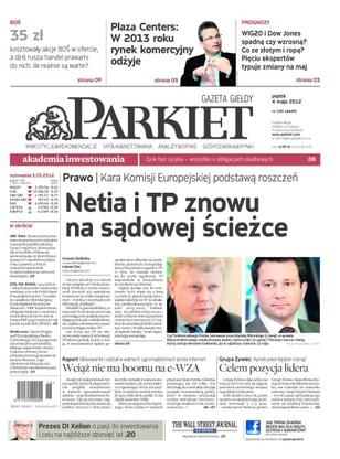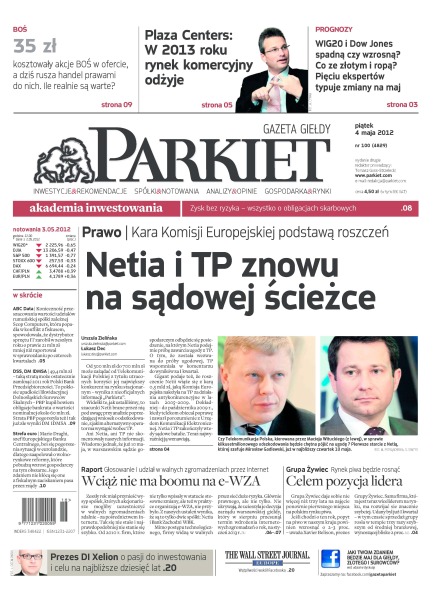 Netia i TP znowu na sądowej ścieżce – kara Komisji Europejskiej podstawą roszczeń; Plaza Centers – w 2013 roku rynek komercyjny odżyje; 35 zł kosztowały akcje BOŚ w ofercie, a dziś rusza handel prawami do nich, ile realnie są warte; prognozy – pięciu ekspertów typuje zmiany na maj; wciąż nie ma boomu na e-WZA – głosowanie i udział w walnych zgromadzeniach przez internet; prezes DI Xelion o pasji do inwestowania i celu na najbliższe dziesięć lat; Polski Bank Przedsiębiorczości może ostatecznie zamknąć 2011 rok z 49,4 mln złotych straty; Mario Draghi, szef Europejskiego Banku Centralnego, boi się pogorszenia sytuacji w eurolandzie, dlatego zaapelował o wolnorynkowe reformy, które pobudzą wzrost gospodarczy na tym obszarze.