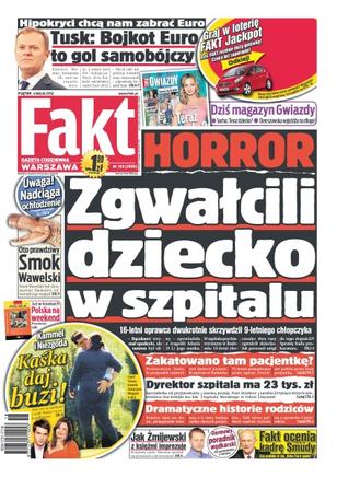 Horror, zgwałcili dziecko w szpitalu – 16-letni oprawca dwukrotnie skrzywdził 9-letniego chłopczyka; jak Żmijewski imprezuje z księżmi; Fakt ocenia kadrę Franciszka Smudy; prokuratura badała przypadek tajemniczej śmierci pacjentki szpitala w Radomiu; dyrektor szpitala ma 23 tysiące złotych pensji i przyjmuje ministra bez kolejki; zobacz jak wygląda prawdziwy smok wawelski; hipokryci chcą nam zabrać Euro – „Bojkot Euro to gol samobójczy” – Donald Tusk; Dereszowska wyjeżdża na długo; Kammel i Niezgoda namiętni na polu golfowym.