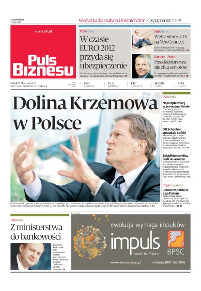 Dolina Krzemowa w Polsce – Mark Ivanowski, partner w funduszu Sofinnova Corebridge, jest przekonany, że znajdzie u nas młode firmy z globalnym potencjałem i wprowadzi je na szerokie wody; w czasie Euro 2012 przyda się ubezpieczenie – wybite szyby, zniszczone bary, zatrucie klienta w restauracji – na wszystko jest odpowiednia polisa; najbezpieczniej w prywatnej firmie – pracownicy sektora prywatnego najsłabiej odczuwają dekoniunkturę; DB Schenker sprzedaje spółki – niemiecka grupa może upłynnić udziały w firmie przewozowej i w porcie; lokata w pakiecie z gadżetem – banki rozdają tablety i telewizory. jednak płaci za nie klient; z ministerstwa do bankowości – Krzysztof Walenczak, były wiceminister skarbu, jako pierwszy Polak pokieruje polskim oddziałem Societe Generale.