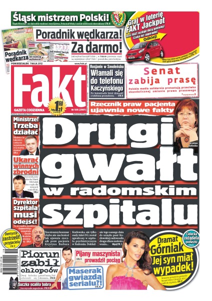 Drugi gwałt w radomskim szpitalu – rzecznik praw pacjenta ujawnia nowe fakty; Rosjanie w Smoleńsku włamali się do telefonu Lecha Kaczyńskiego – po katastrofie ktoś dzwonił z telefonu prezydenta; pijany maszynista prowadził pociąg; czy Maserak zostanie gwiazdą serialu; piorun zabił chłopców – dwaj koledzy schronili się przed burzą, pod drzewem; dramat Edyty Górniak jej syn miał groźny wypadek; Magdalena Cielecka zażądała podwyżki; suczka ocaliła bobra – Aza wyczuła zagrożenie; minister Arłukowicz czeka na wyjaśnienia, a tu trzeba działać; rzecznik praw dziecka Marek Michalak chce sądu dla winnych zaniedbań; Śląsk Wrocław mistrzem Polski.