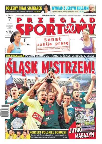 Śląsk Wrocław mistrzem Polski; rekordowa polska Borussia – rewelacyjny koniec sezonu Borussii Dortmund i trzech reprezentantów Polski, mistrz pobił rekord Bundesligi; nic nie jest wieczne – pożegnanie Guardioli na Camp Nou Messi okrasił czterema golami; piękny sen o Londynie przerwany – polskie siatkarki przegrały z Turcją mecz finałowy w Ankarze i nie pojadą na tegoroczne igrzyska olimpijskie; i znów Gargamel – w Madrycie Agnieszka Radwańska ponownie ma na kursie Wiktorię Azarenkę; Bartosz Kurek w klubie KGB – reprezentant Polski podpisał dwuletnią umowę z wicemistrzem Rosji Dynamem Moskwa – razem z Matthew Andersonem mają stworzyć duet, który zdetronizuje Zenita Kazań.