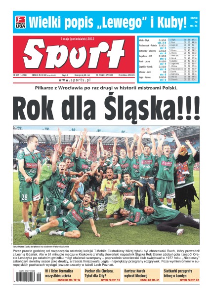 Rok dla Śląska – piłkarze z Wrocławia po raz drugi w historii mistrzami Polski; wielki popis „Lewego” i Kuby – Robert Lewandowski dwie, Jakub Błaszczykowski dwie i Borussia Dortmund wygrała na koniec sezonu 4-0 i pobiła rekord ligi wszech czasów; Chelsea Londyn po raz siódmy w historii zdobyła Puchar Anglii; Lionel Messi uczcił pożegnanie trenera Josepa Guardioli zdobyciem czterech bramek w derbach Katalonii; Agnieszka Radwańska wygrała z 20-letnią Hiszpanką Larą Arruabarreną-Vecino w pierwszej rundzie turnieju WTA w Madrycie; Bartosz Kurek wybrał Moskwę – w Dynamie polski przyjmujący ma zarobić 650 tysięcy euro za sezon.
