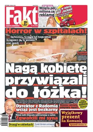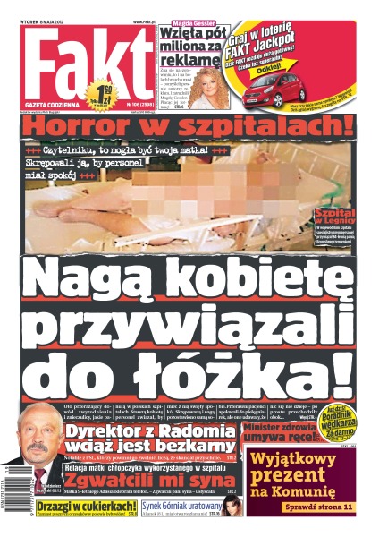 Horror w szpitalach – nagą kobietę przywiązali do łóżka, skrępowali ją by personel miał spokój; dyrektor z Radomia wciąż jest bezkarny; „Zgwałcili mi syna” – relacja matki chłopczyka wykorzystanego w szpitalu; Magda Gessler wzięła pół miliona za reklamę; minister zdrowia umywa ręce; synek Edyty Górniak uratowany – Allanek miał otwarte złamanie; drzazgi w cukierkach – zamiast pysznych orzeszków w polewie były wióry; Rosjanie wykradli sekrety z telefonu prezydenta – najważniejsze telefony w państwie, służbowe SMS-y – to było w telefonie Lecha Kaczyńskiego; majówka pani premierowej – kosi trawę aż furczy; zabił kochankę z internetu, bo okazała się mężczyzną.