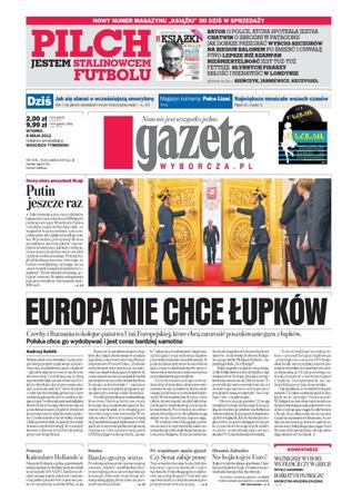 Europa nie chce łupków – Czechy i Rumunia to kolejne państwa Unii Europejskiej, które chcą zamrozić poszukiwanie gazu z łupków – Polska chce go wydobywać i jest coraz bardziej samotna; Władimir Putin jeszcze raz – nowy-stary prezydent Rosji; kalendarz Hollande'a – Francois Hollande z jedną z pierwszych wizyt pojedzie do Berlina, weźmie udział w szczytach G8 i NATO; czy Senat zabije prasę – trzy senackie komisje będą dziś dyskutować o sprostowaniach i odpowiedziach, czy posłuchają apelu redaktorów naczelnych gazet; czy wybory we Francji były ważniejsze niż w Grecji; jak się starać o wcześniejszą emeryturę – kto i na jakich zasadach może krócej pracować.