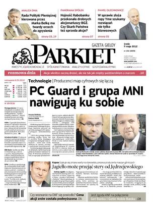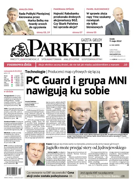 PC Guard i grupa MNI nawigują ku sobie – producenci map cyfrowych się łączą; Jagiełło może przejąć stery od Jędrzejewskiego – szykuje się zmiana warty na stanowisku prezesa producenta maszyn górniczych; czy wezwanie na EMF się powiodło – cena akcji znów została podwyższona; jest zgoda KNF na połączenie Get Banku i Getin Noble Banku; Rada Polityki Pieniężnej kierowana przez Marka Belkę ma twardy orzech do zgryzienia; hojność Rabobanku przekonała drobnych akcjonariuszy BGŻ – czy Skarb Państwa też sprzeda akcje; „W sprawie złoża ropy Yme szukamy rozwiązań nie tylko biznesowych” – Paweł Olechnowicz; producent armatury sanitarnej, Armatura Kraków, zwiększa zyski głównie dzięki obniżce kosztów i poprawie marż; BRE Bank zarobiła w I kwartale 331,1 mln zł, o 44 procent więcej niż przed rokiem.