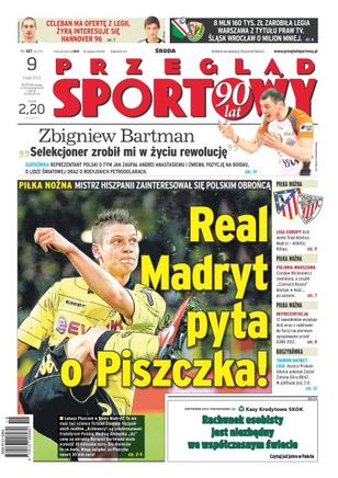 Real Madryt pyta o Piszczka – mistrz Hiszpanii zainteresował się polskim obrońcą; „Selekcjoner zrobił mi w życiu rewolucję” – Zbigniew Bartman o tym jak zaufał Andrei Anastasiemu i zmienił pozycję na boisku oraz o lidze światowej i rosyjskich petrodolarach; 8 milionów 160 tysięcy złotych zarobiła Legia Warszawa z tytułu praw TV – Śląsk Wrocław zarobił o milion złotych mniej; Celeban ma ofertę z Legii, Żyrą interesuje się Hannover 96; dziś wielki finał Atletico Madryt - Atletico Bilbao; Czesław Michniewicz został zwolniony, a Polonia Warszawa dostaje w kość po sezonie; 12 zawodników reprezentacji wylatuje dziś wraz z rodzinami do Turcji na pierwsze zgrupowanie przed Euro 2012; Asseco Prokom Gdynia pokonał Zastal Zielona Góra 88-67.
