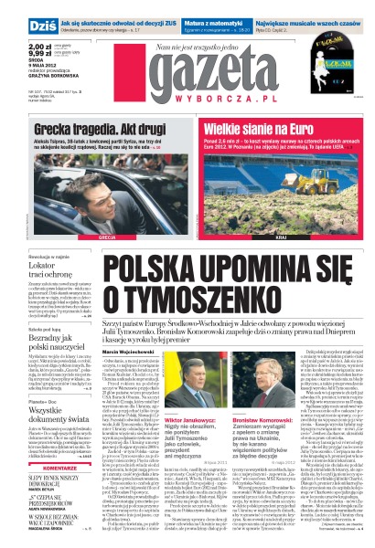 Polska upomina się o Tymoszenko – szczyt państw Europy Środkowo-Wschodniej w Jałcie odwołany z powodu więzionej Julii Tymoszenko – Bronisław Komorowski zaapeluje dziś o zmiany prawa nad Dnieprem i kasację wyroku byłej premier; Grecka tragedia, akt drugi – Aleksis Tsipras, 38-latek z lewicowej partii Syriza, ma trzy dni na sklejenie koalicji rządowej – raczej mu się to nie uda; wielkie sianie na Euro – ponad 2,6 miliona złotych – to koszt wymiany murawy na czterech polskich arenach Euro 2012; jak się skutecznie odwołać od decyzji ZUS – odwołanie, pozew zbiorowy czy skarga; bezradny polski nauczyciel – badania pokazują, że młodzi nauczyciele nie potrafią utrzymać dyscypliny w klasie, zarządzać grupą uczniów i nadążyć za szkolną biurokracją; wszystkie dokumenty świata – jutro w Warszawie początek festiwalu Planete+ Doc najlepszych filmowych dokumentów.