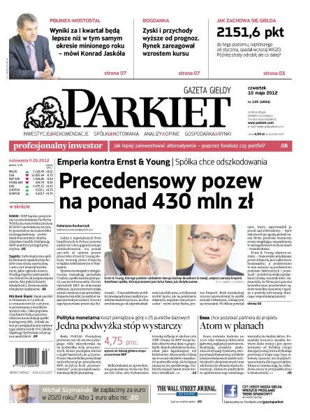 Precedensowy pozew na ponad 430 milionów złotych – Emperia kontra Ernst and Young, spółka chce odszkodowania; Polimex Mostostal – wyniki za I kwartał będą lepsze niż w tym samym okresie minionego roku; Bogdanka – zyski i przychody wyższe od prognoz – rynek zareagował wzrostem kursu; jedna podwyżka stóp wystarczy – koszt pieniądza w górę o 25 punktów bazowych; atom w planach – Enea chce pozyskać partnera do projektu; MSP bardzo pozytywnie ocenia działania Herberta Wirtha na stanowisku prezesa KGHM i opowiada się za tym, by pozostał on na stanowisku na drugą kadencję; Sygnity – tłumaczy spadek przychodów oraz stratę operacyjną i netto za I kwartał wezwaniem, jakie ogłosiło Asseco; ING Bank Śląski zarobił w I kwartale 271,5 mln zł, co oznacza wzrost o 28 procent w porównaniu z wynikiem sprzed roku.