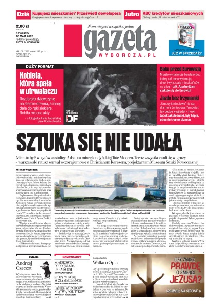 Sztuka się nie udała – miała to być wizytówka stolicy Polski na miarę londyńskiej Tate Modern – teraz wszystko wali się w gruzy – warszawski ratusz zerwał wczoraj umowę z Christianem Kerezem, projektantem Muzeum Sztuki Nowoczesnej; jeśli kupujesz mieszkanie, prześwietl dewelopera – czego po zmianach w prawie możesz się od niego domagać; kobieta, która spała w utrwalaczu – „Rozebrała dziewczynę na stercie drewna, a innej dała do ręki siekierę, robiła mocne akty” – Dorota Jarecka o fotografce Irenie Jarosińskiej; Baku przed Eurowizją – miasto wynajmuje bandziorów, którzy o 6 rano wyłamują drzwi i wyrzucają mieszkańców na ulicę – tak Azerbejdżan szykuje się do Eurowizji.