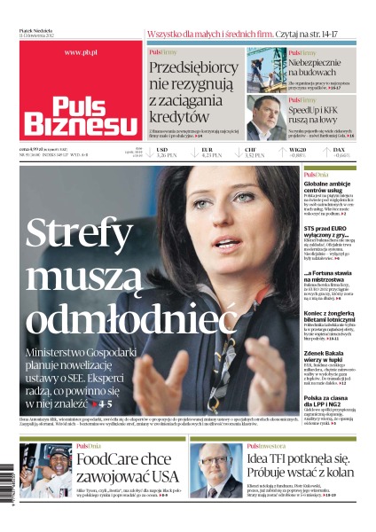 Strefy muszą odmłodnieć – Ministerstwo Gospodarki planuje nowelizację ustawy o specjalnych strefach ekonomicznych – eksperci radzą, co powinno się w niej znaleźć; przedsiębiorcy nie rezygnują z zaciągania kredytów – z finansowania zewnętrznego korzystają najczęściej firmy małe i produkcyjne; niebezpiecznie na budowach – zła organizacja pracy to najczęstsza przyczyna wypadków; SpeedUp i KFK ruszą na łowy – Bartłomiej Gola uważa, że na rynku pojawiło się wiele ciekawych projektów; globalne ambicje centrów usług – Polska jest na piątym miejscu na świecie pod względem liczby osób zatrudnionych w centrach usług; Polska za ciasna dla LPP i NG2 – giełdowe spółki przyspieszają zagraniczną ekspansję; FoodCare chce zawojować USA – Mike Tyson ma zdobyć dla napoju Black połowę polskiego rynku i poprowadzić go za ocean.